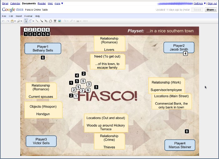 This, above, is a Fiasco table/setup as built in the new version of Google Docs Drawing. Pretty, huh?