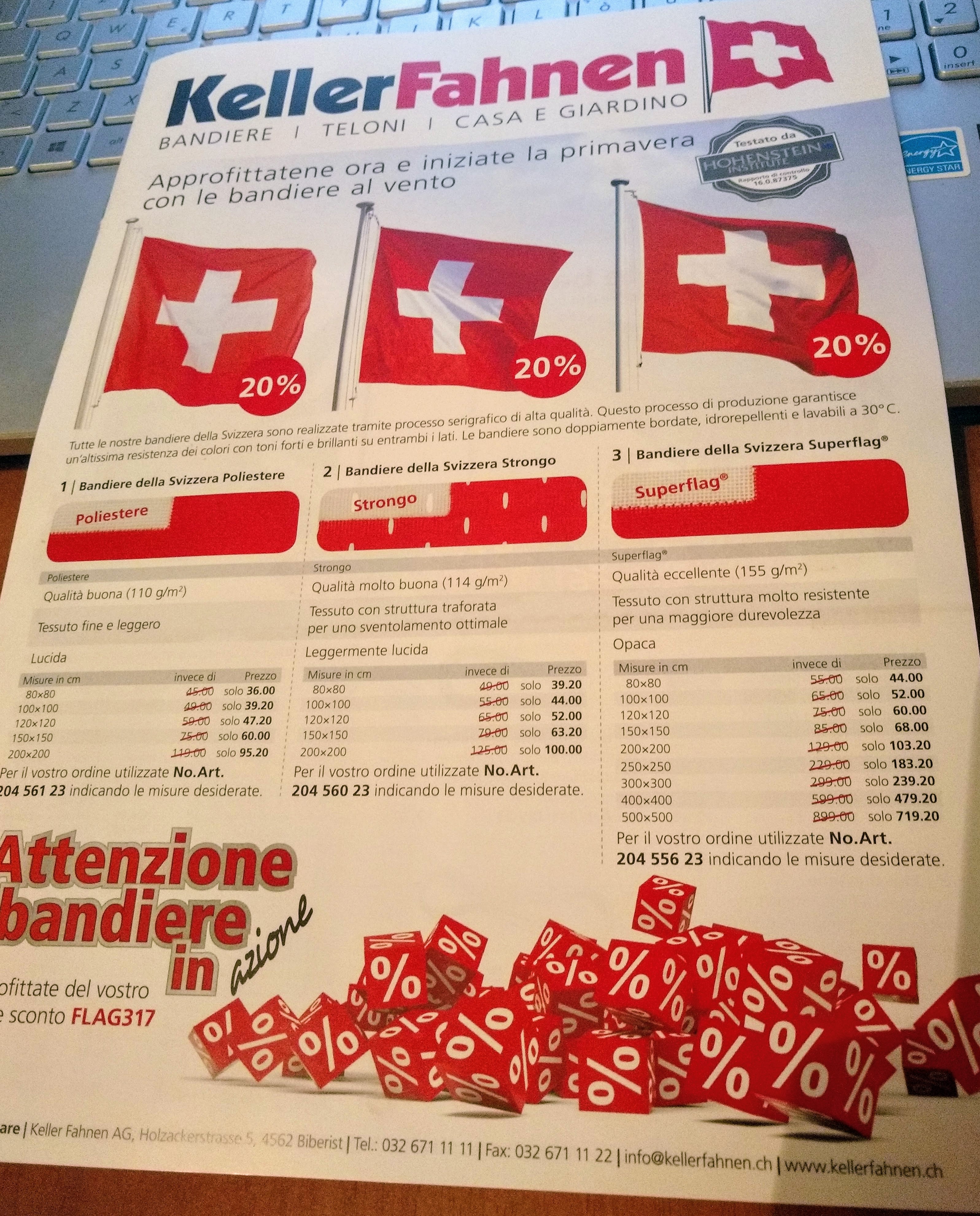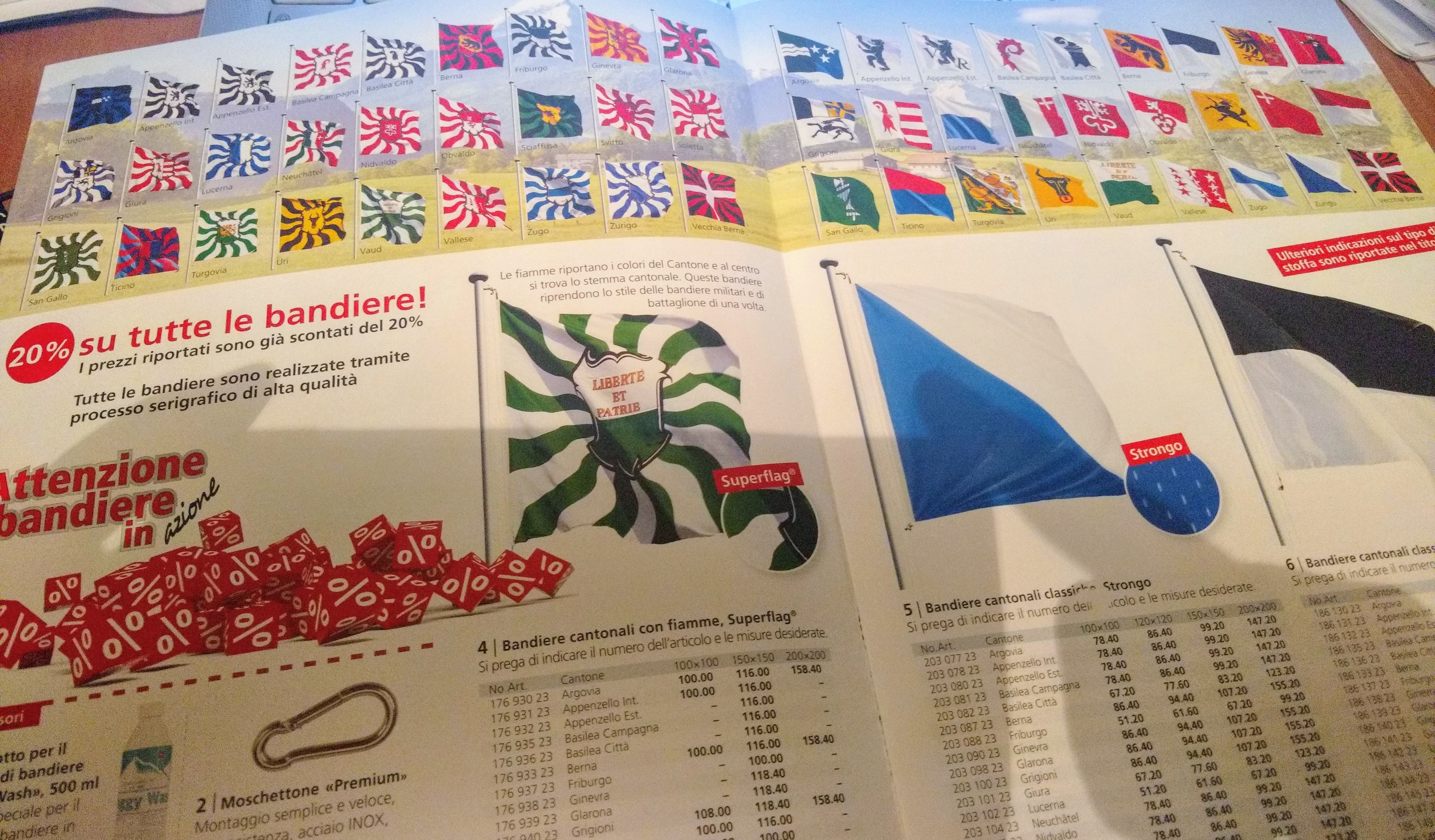Here, instead, I received a booklet advertising a flag company, where you can buy flags in 3 different grades of cloth of growing quality, carabiners, poles, ropes, and even special flag-cleaning products to wash them! And they don’t just make the red Swiss federal flag, obviously, but one flag per Canton (which is to be expected)… but also for each single Municipality, City and other local institutions! Plus, whimsical Swiss flags featuring super-swiss things like Cows, Edelweiss, and so on.