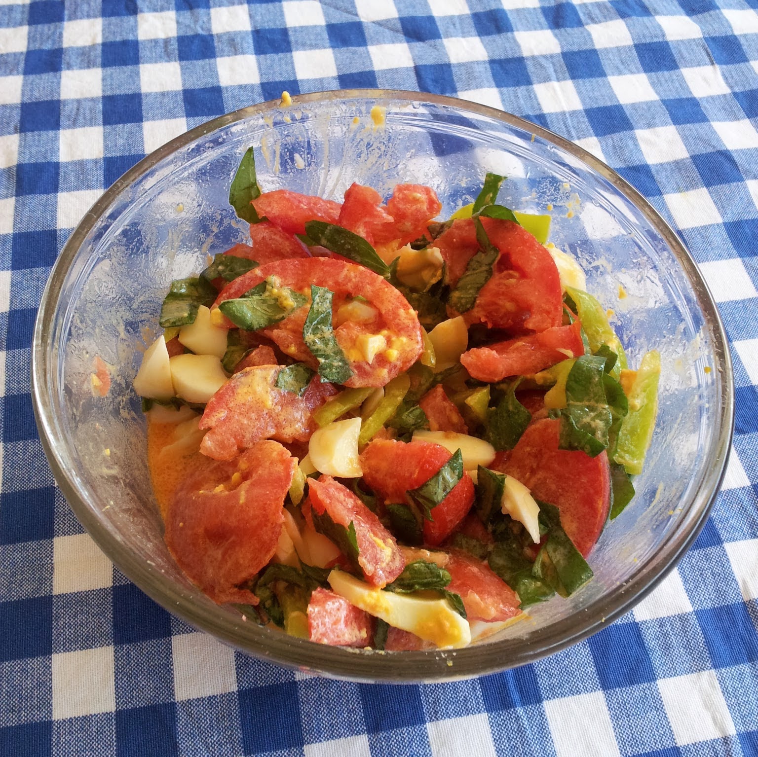 By now the eggs should be cool: remove the shells and cut the hard boiled eggs. Here comes the trick (for my personal taste) to a perfect cundijùn: take the firm yellow egg yolk, reduce it to small bits and spread it in the salad. Now add the white bits and mix again, thoroughly.